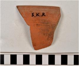 | Description / विवरण | A fragment of a bowl of red ware with featureless rim, tapering sides, convex profile, having incised horizontal lines on the exterior, of fine fabric. |