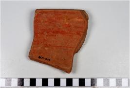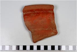 | Description / विवरण | A fragment of a basin of red ware with externally thickened rim, having row of incised horizontal line on rim top straight sides, treated with red slip of medium fabric. |