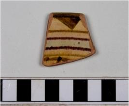 | Description / विवरण | A fragment of a rim of glazed ware with featureless rim, painted with black showing horizontal bands on the inner surface of fine fabric. |