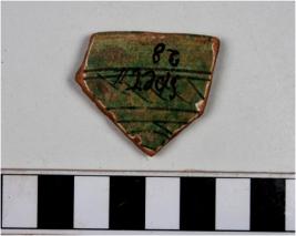 | Description / विवरण | Fragment of rim a bowl of glazed ware having featureless rim straight sides with greenish surface on both sides and painted with horizontal lines in between oblique lines in black on the interior of fine fabric. |