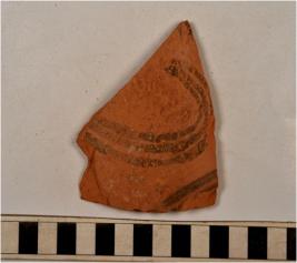 | Description / विवरण | A potsherd of red ware painted with black showing concentric circles on exterior of medium fabric. |