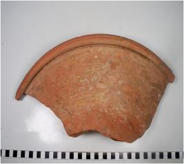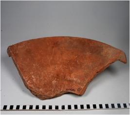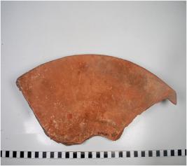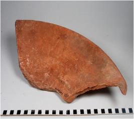 | Description / विवरण | A fragment of a base of dish on stand of red ware with flaring profile, showing incised rows of oblique strokes of medium fabric. |