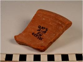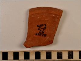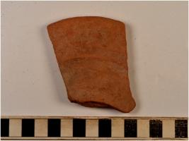 | Description / विवरण | A fragment of a bowl of red ware with featureless rim and straight sides of fine fabric fine texture. |