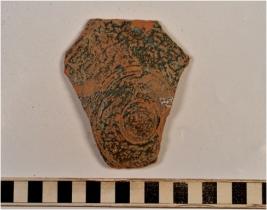 | Description / विवरण | A potsherd of a green glazed ware showing incised concentric circles on exterior of medium fabric. |