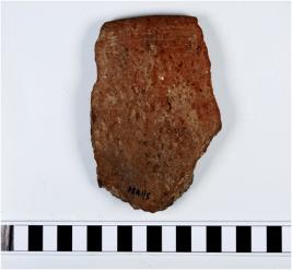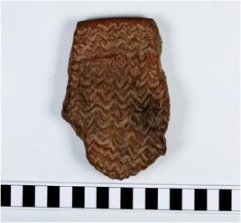 | Description / विवरण | fragment of rim a basin of red ware with thickened rim straight sides showing incised continuous wavy lines on inner surface. |