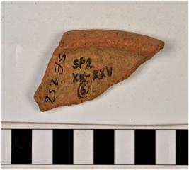 | Description / विवरण | A fragment of a pot of dull red ware with incurved rim and tapering sides of coarse fabric. |
