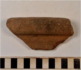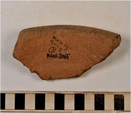 | Description / विवरण | A fragment of a pot of red ware with externally thickened rim of thick fabric tempered with mica content and sturdy texture. |