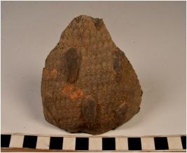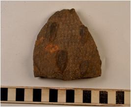 | Description / विवरण | A fragment of a globular pot in grey colour having impression of droplet on the outer surface with applique motive above it of thick fabric. |