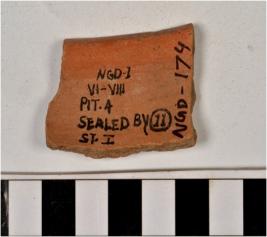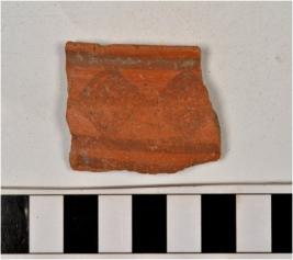 | Description / विवरण | A fragment of a bowl of red ware with out turned rim, straight sides and painted with black showing geometrical design on surface of fine fabric. |
