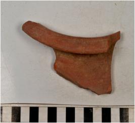 | Description / विवरण | A fragment of a vase of red ware with flanged rim, concave neck, oblique sides, spreading shoulder of fine fabric. |