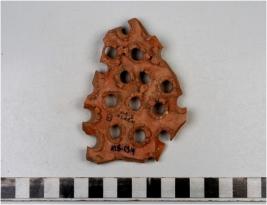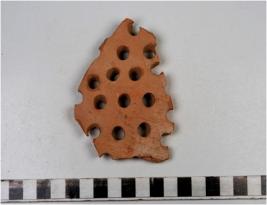 | Description / विवरण | A potsherd of red ware with perforated surface of medium fabric. |