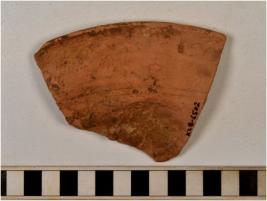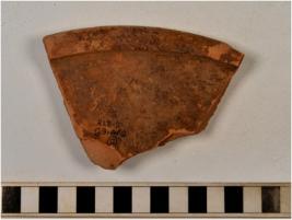 | Description / विवरण | A fragment of a dish of red ware with externally thickened rim, flat base of medium fabric. |