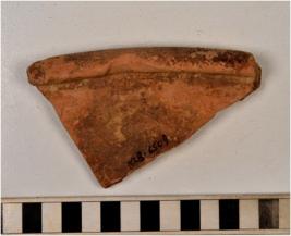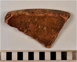 | Description / विवरण | A fragment of a basin of red ware with externally thickened rim, tapering sides, treated with chocolate slip of thick fabric. |