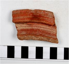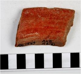 | Description / विवरण | fragment of rim a vase of red ware with out turned thickened rim, concave neck and tapering sides treated with red slip. |