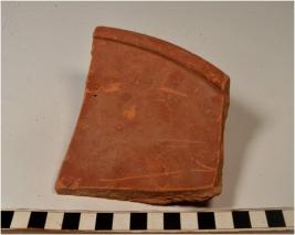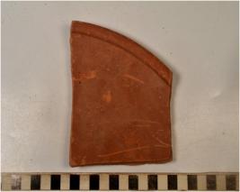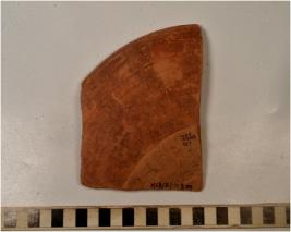 | Description / विवरण | Fragment of rim a dish of red ware with out curved rim, discular base rib, treated with red slip in inner surface of fine fabric. |