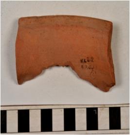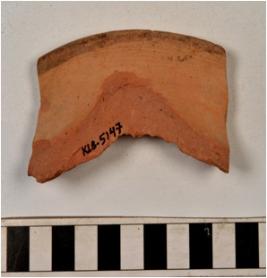 | Description / विवरण | A fragment of a vase of red ware with out turned rim painted with black showing horizontal band on its exterior concave neck, oblique sides of medium fabric. |