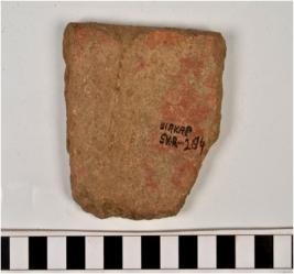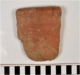 | Description / विवरण | A fragment of a miniature jar of red ware with featureless rim and straight sides of coarse fabric sturdy texture. |