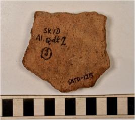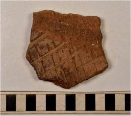 | Description / विवरण | A potsherd of a dull red ware showing incised ladder design on exterior of medium fabric. |
