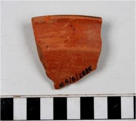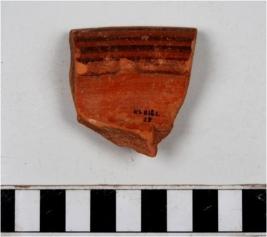 | Description / विवरण | A fragment of a bowl of slipped red ware with out turned rim painted with horizontal lines in black on the top of rim of medium fabric. |