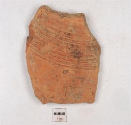 | Description / विवरण | Potsherd of a vessel of red ware decorated with horizontal incised lines, well baked, medium fabric surface treated with red slip. |