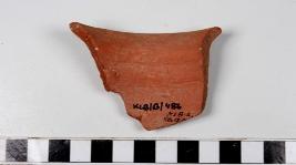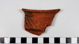 | Description / विवरण | A fragment of a miniature vase of red ware with out turned rim, concave neck, tapering sides, painted with black showing oblique lines inbetween horizontal bands on exterior of fine fabric. |