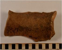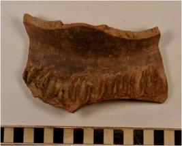 | Description / विवरण | A fragment of potsherd a vase of red ware, slightly concave neck having applique oblique strokes oblique sides of medium fabric. |
