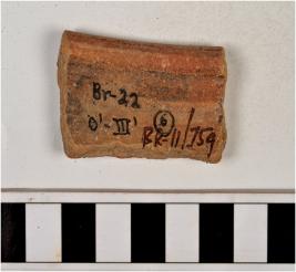 | Description / विवरण | Fragment of rim a bowl of red ware with slightly incurved rim and straight sides of medium fabric. |