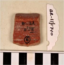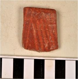 | Description / विवरण | A fragment of a bowl of red ware with slightly incurved rim, straight sides and showing painted with oblique design on exterior. |