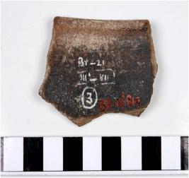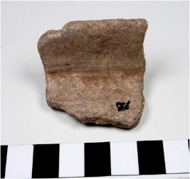 | Description / विवरण | Fragment of rim a bowl of red ware with slightly incurved rim, straight sides, showing row of vertical dotted line on the exterior, of medium fabric, treated with black slip. |