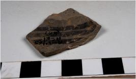 | Description / विवरण | A potsherd of painted grey ware with black showing horizontal bands on the inner surface, of fine fabric, fine texture. |
