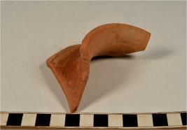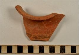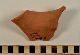 | Description / विवरण | A fragment of a vase of red ware with out turned rim, concave neck, oblique sides, painted with black showing horizontal band on exterior of fine fabric. |