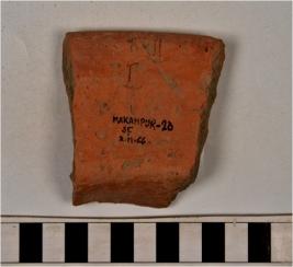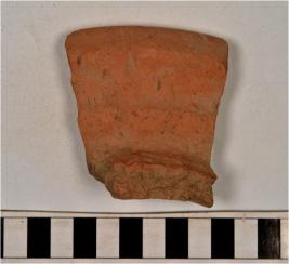 | Description / विवरण | A fragment of a vase of red ware with thickened rim having grooves and straight sides of coarse fabric. |