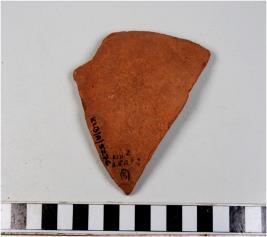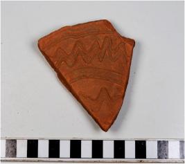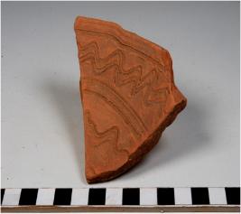 | Description / विवरण | A potsherd of a red ware showing incised wavy lines inbetween horizontal lines on interior of fine fabric. |