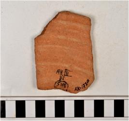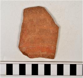 | Description / विवरण | A potsherd of dull red ware showing group of incised horizontal lines inside, of medium fabric, treated with red slip. |
