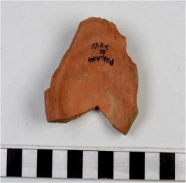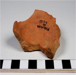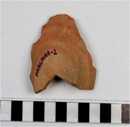 | Description / विवरण | A fragment of a base of red ware with disc base of medium fabric. |