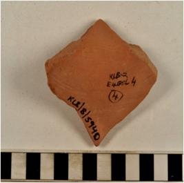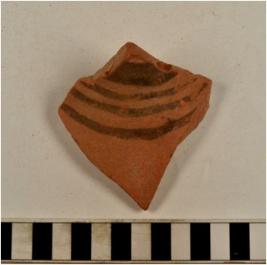 | Description / विवरण | A potsherd of a red ware painted with black showing horizontal bands on exterior of fine fabric. |