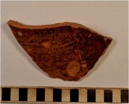 | Description / विवरण | A potsherd of slipped red ware painted with horizontal lines and double circles filled with dot in black on the exterior of thick fabric, fine texture well levigated. |