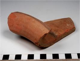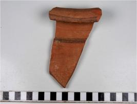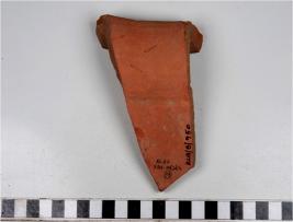 | Description / विवरण | A fragment of a jar of red ware with flanged rim, concave neck, painted with black showing horizontal band on exterior, oblique sides of fine fabric. |