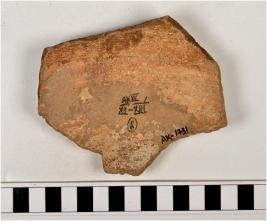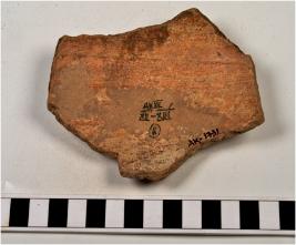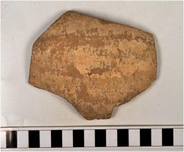 | Description / विवरण | A potsherd of dull red ware treated with cream slip globular body, of medium fabric. |