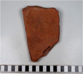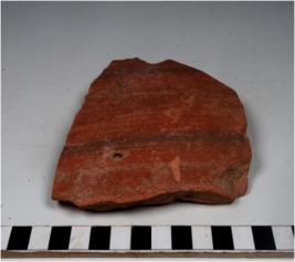 | Description / विवरण | A potsherd of a red ware painted with black showing horizontal bands and incised oblique strokes on exterior of fine fabric. |