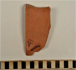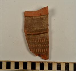 | Description / विवरण | A potsherd of red ware having ridges painted with black showing horizontal band filled with vertical strokes on exterior of medium fabric. |