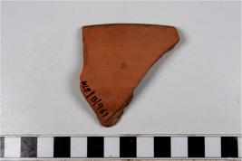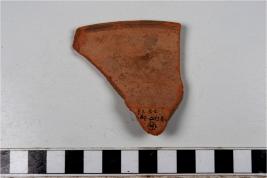 | Description / विवरण | A fragment of a dish of red ware with splayed out rim, painted with black showing horizontal band on exterior, flat base of fine fabric. |