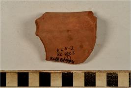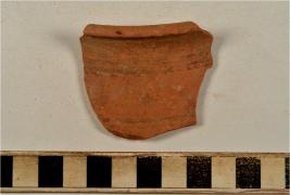 | Description / विवरण | A fragment of a vase of red ware with slightly out turned rim, oblique sides, painted with black showing horizontal lines on exterior of fine fabric. |
