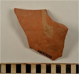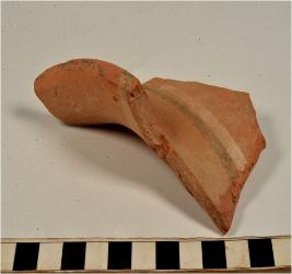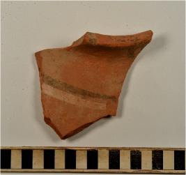 | Description / विवरण | A fragment of a vase of red ware with out turned rim, concave neck, oblique sides, painted with black and white showing horizontal band on exterior of fine fabric. |