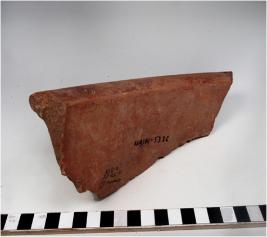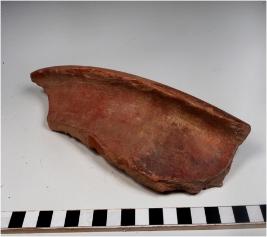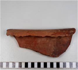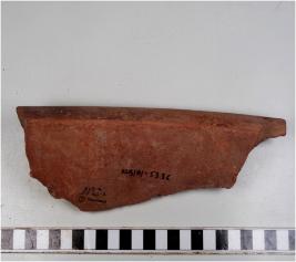 | Description / विवरण | A fragment of a jar slipped of red ware with out curved rim, concave neck, oblique sides of thick fabric. |