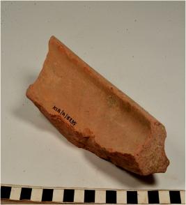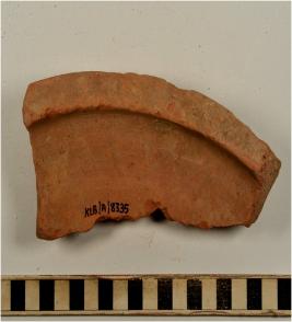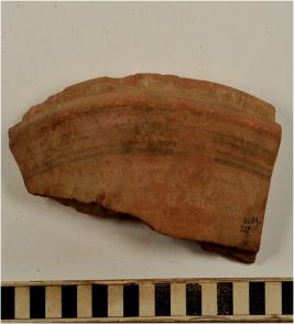 | Description / विवरण | A fragment of a base of a dish on stand of red ware with flaring rim, painted with black showing horizontal band on exterior of fine fabric. |