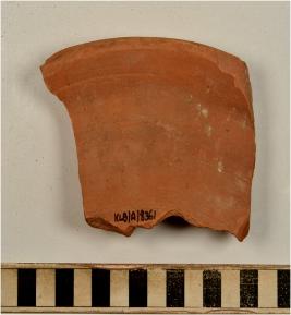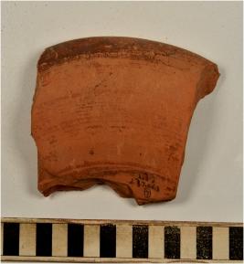 | Description / विवरण | A fragment of a dish of red ware with out turned rim, tapering sides, painted with black showing loops design on interior of fine fabric. |