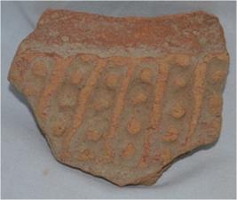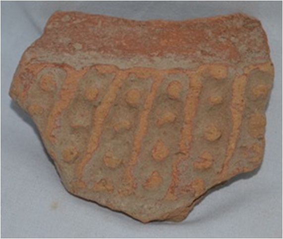 Dull sherd with vertical bands and rows of dots in between them in relief.