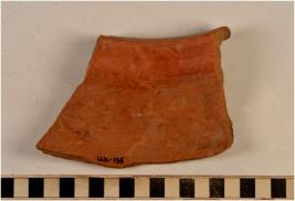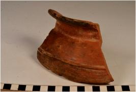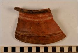 | Description / विवरण | A fragment of a handi of red ware with flanged rim concave neck, carination on shoulder, tapering sides, treated with red slip of medium fabric and ill fired. |