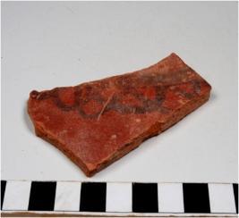 | Description / विवरण | A potsherd of a red ware treated with red slip painted with black showing loop chain pattern on exterior of fine fabric fine texture. |
